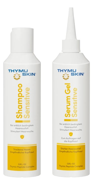 Thymuskin Sensitive is a specialized hair care line formulated to address severe hair thinning. It contains a higher concentration of the GKL-02 active complex compared to the Classic line, making it ideal for individuals experiencing advanced hair loss. Designed for sensitive scalps and those with noticeable balding, Thymuskin Med works to strengthen hair follicles, improve scalp health, and promote hair growth. Like its Classic counterpart, it is free from harmful chemicals and suitable for both men and women.